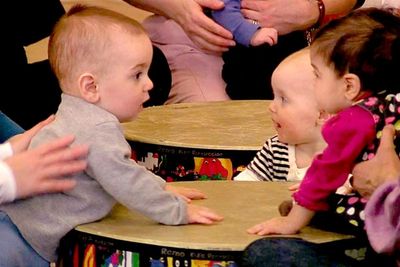 The group setting gives baby the opportunity to communicate with others through the exchange of facial expression and smiling. The use of the voice is incorporated into any activity through clinical improvisation. For example, if a baby is making a squealing noise, this sound is automatically echoed in the song. Babies will often increase their verbal expression and frequency of facial expressions by the end of a single workshop.